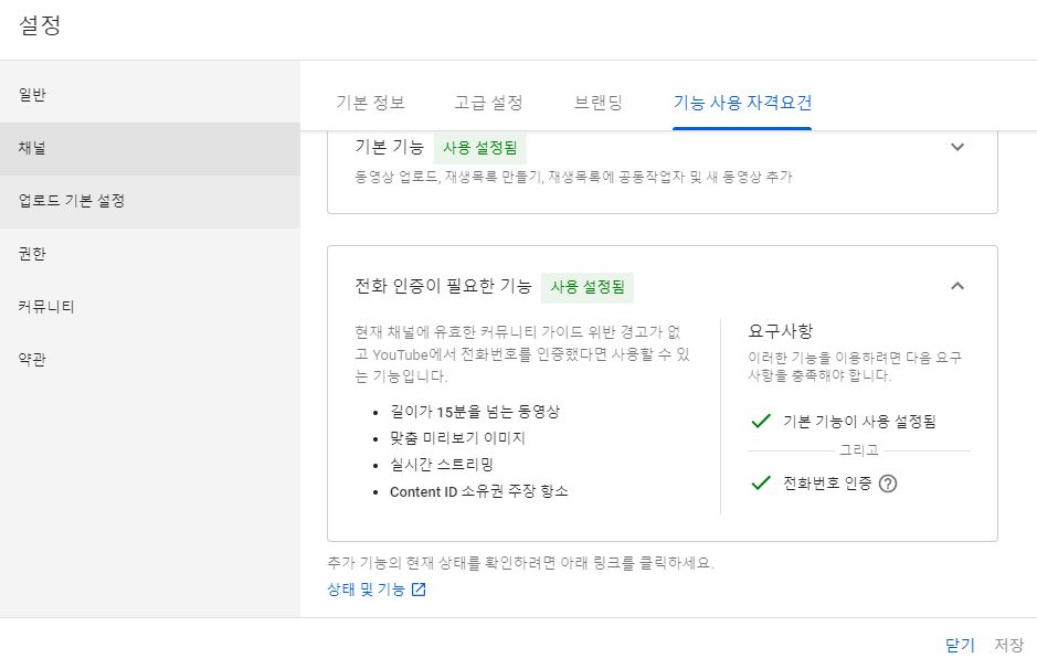 [ 채널 ] 탭의 [ 기능 사용 자격요건 ] 항목에 가시면